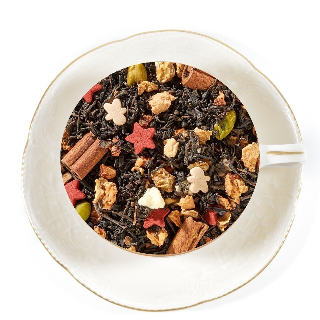 Contains: black tea, apple pieces, red sugar stars (sugar, rice flour, vegetable oil), glazing agent: shellac, potato starch, colouring agent: E172, natural food colouring: (concentrated sweet potato,apple, radish and cherry), flavouring, cinnamon rods, sugar gingerbread men (sugar, rice flour, vegetable oil), potato starch, colouring agent E 150c), pistachios, freeze-dried pear pieces, cinnamon pieces.