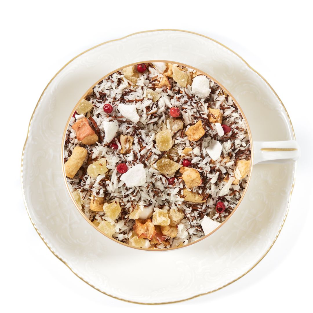 Contains: Rooibos tea, coconut flakes, pineapple cubes, apple cubes, flavouring, freeze-dried yoghurt granules (milk), freeze-dried marzipan drops (almonds), pink peppercorns.